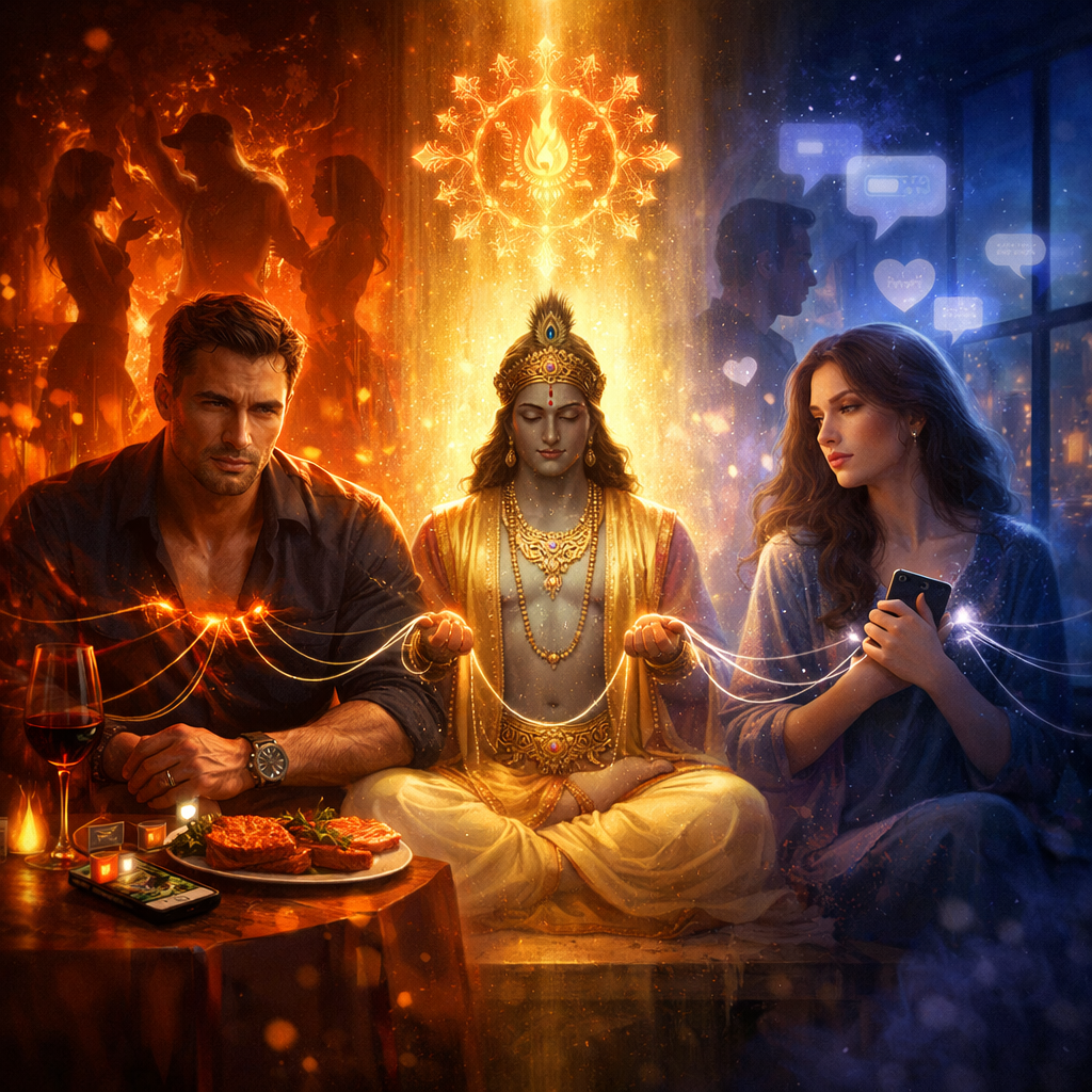 Krishna không nói riêng về rượu và xác thịt. Ông nói về “đối tượng của giác quan”. Đối tượng có thể là ánh nhìn, lời hứa, sự ưu tiên, những cảm xúc…